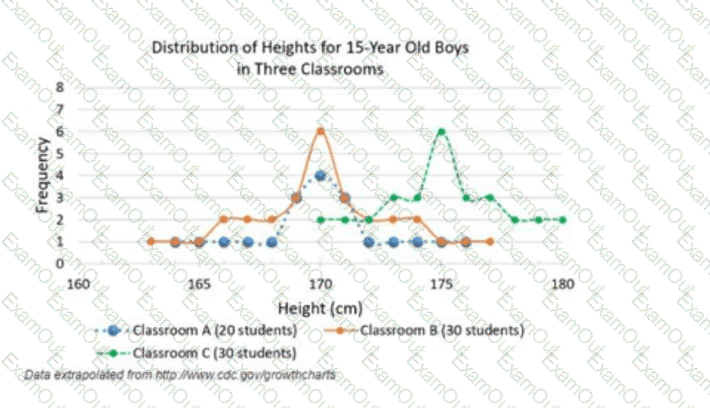 The graph displays the distribution of the heights of 15-year-old boys in three classrooms.