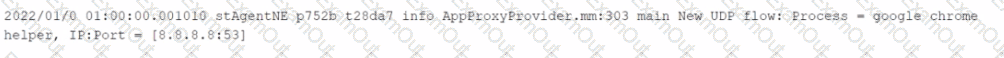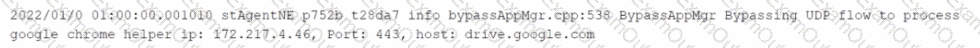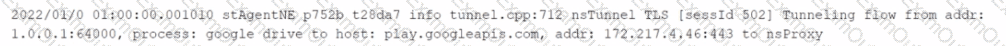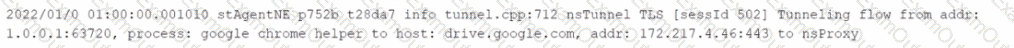 You want to verify that Google Drive is being tunneled to Netskope by looking in the nsdebuglog file. You are using Chrome and the Netskope Client to steer traffic. In this scenario, what would you expect to see in the log file?