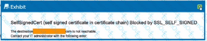 You are the proxy administrator for a medical devices company. You recently changed a pilot group of users from cloud app steering to all Web traffic. Pilot group users have started to report that they receive the error shown in the exhibit when attempting to access the company intranet site that is publicly available. During troubleshooting, you realize that this site uses your company's internal certificate authority for SSL certificates.