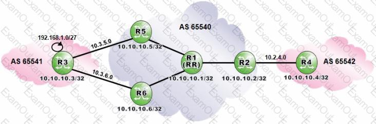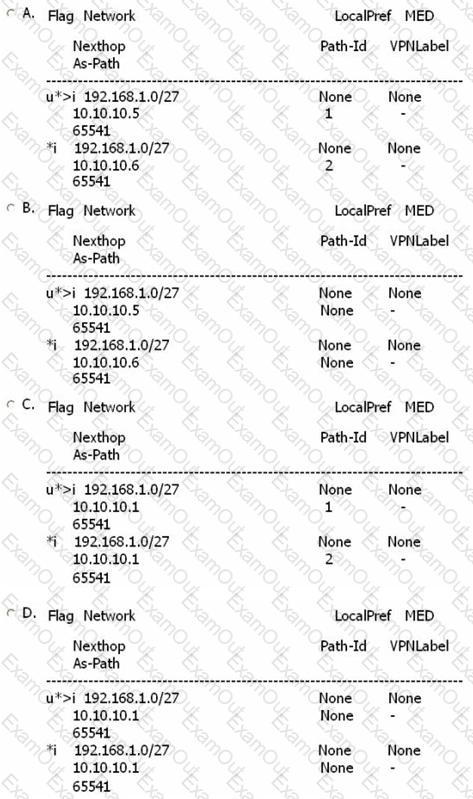 Router R1 is a route reflector with clients R2, R5 and R6. Router R3 advertises the prefix 192.168.1.0/27 to routers R5 and R6. Assuming that routers R1, R2 and R4 are configured with "add-paths ipv4 send 2 receive", what is the expected output of "show router bgp routes" when executed on router R2?
