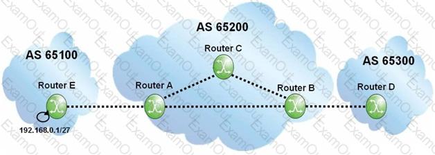 Assuming that none of the routers within AS 65200 is configured with next-hop-self", what will the BGP update for the 192.168.0.1/27 prefix contain when it arrives at router B?