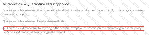 An administrator of a Nutanix Enterprise Cloud has microsegmentation enabled and a firewall VM installed. The security team notifies the administrator that one of the VMs hosted in the environment has been exhibiting suspect network activity. The administrator wants to isolate the VM from the production network, but must still be able to access it to perform diagnostics.