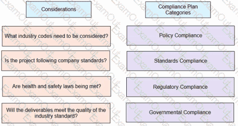 A project manager is leading a project in a heavily regulated industry. Match the considerations on the left with the correct compliance plan categories on the right.