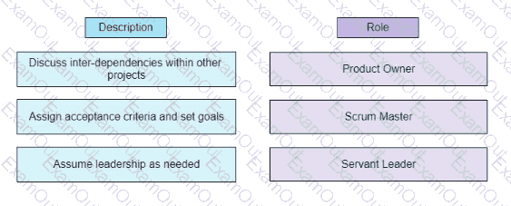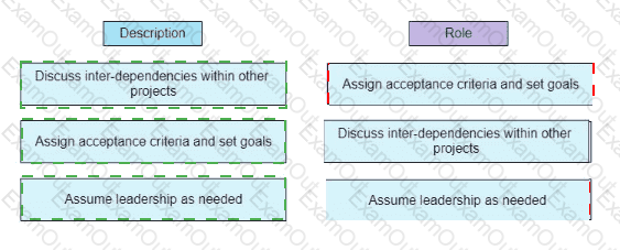 A new project manager for an agile project is reviewing with an established team, some of the roles to avoid confusion on what to expect. Drag the description on the left to the role on the right