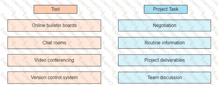 An agile team is geographically separated across multiple continents, and the project manager of identifying the tools to manage the communication among the virtual teams Drag the appropriate tool on the left to each project task on the right