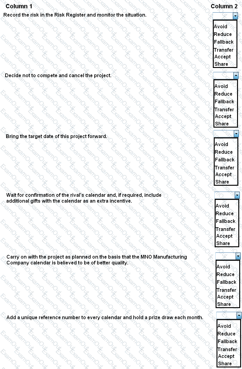 The project is now in stage 2. The Project Manager has heard about the possibility of a competitor also producing a calendar to be delivered earlier than the target date for this project. There is a threat that the early release of a competitor's calendar may weaken the impact of the MNO Manufacturing Company calendar, thereby reducing the anticipated benefits of the Calendar project.