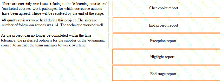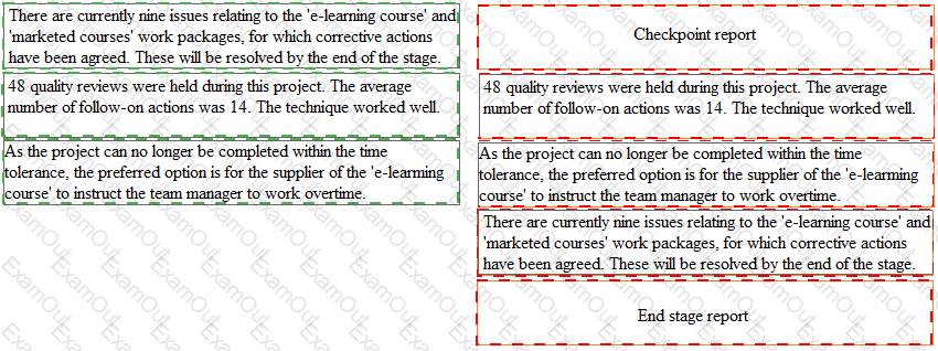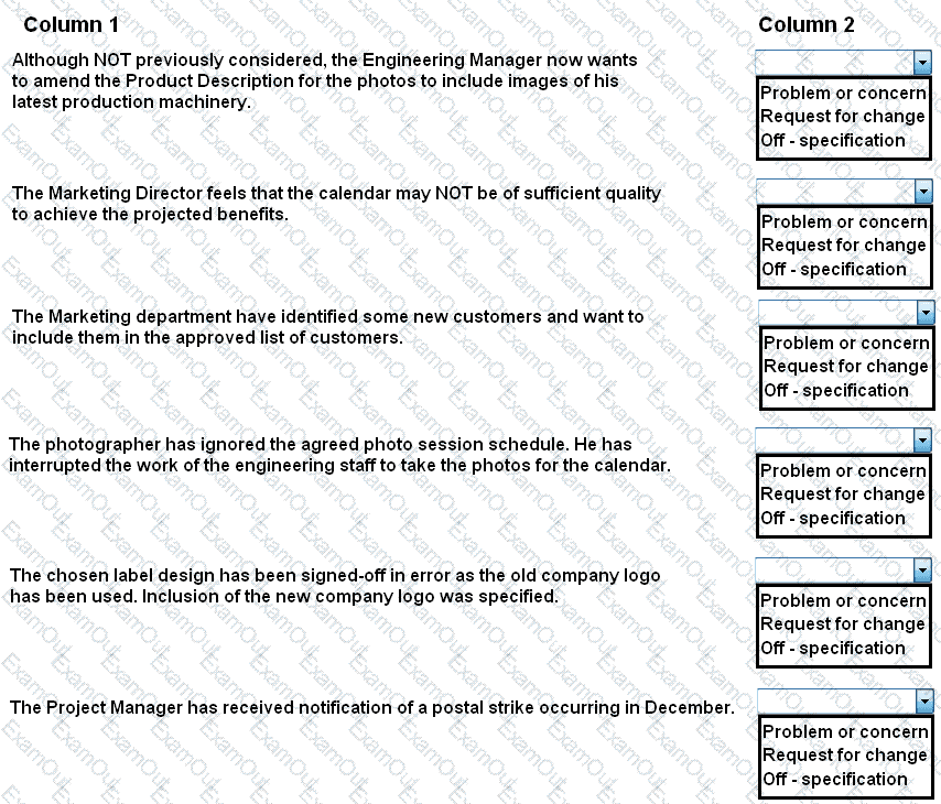 Column 1 contains a number of issues for this project. Select from Column 2 the appropriate category for each issue. Each selection from Column 2 can be used once, more than once or not at all.