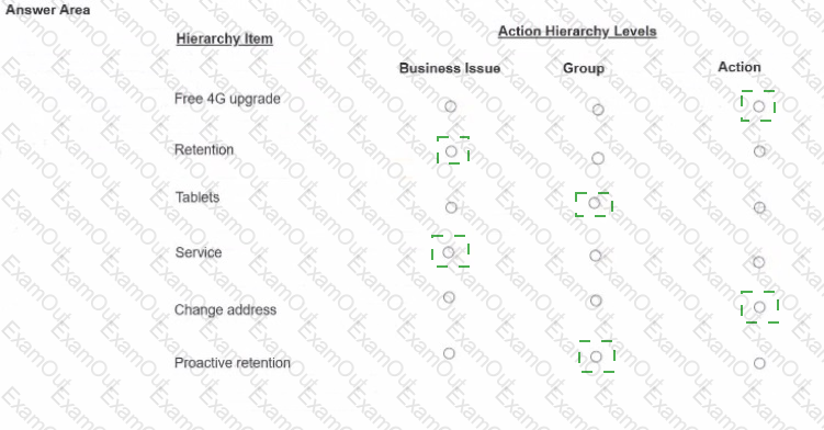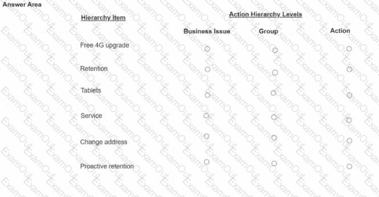 As a decisioning architect, you are setting up the action hierarchy for MyCo. Select the correct action hierarchy level for each of the hierarchy items identified.
