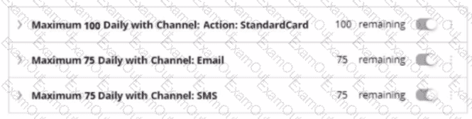 An outbound run identifies 150 Standard card offers, 75 on email, and 75 on the SMS channel. If the following volume constraint is applied, how many actions are delivered by the outbound run?