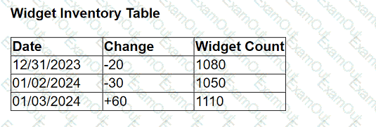 A client has a database that stores widget inventory by day and it is updated on a nonstandard schedule as shown below.