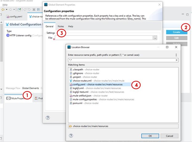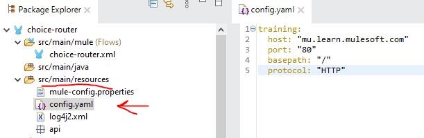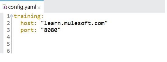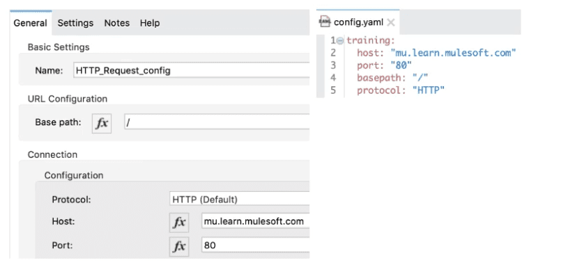 A Mule application has an HTTP Request that is configured with hardcoded values. To change this, the Mule application is configured to use a properties file named config.yaml.