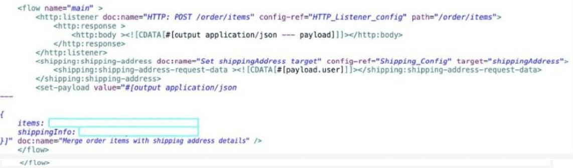 A Mule application is being developed to process web client POSTrequests with payloads containing order information including the user name and purchased items The Shipping connector returns a shipping address for the input payloads user name The Shipping connector's Shipping Address operation is configured with a target named shippingAddress.