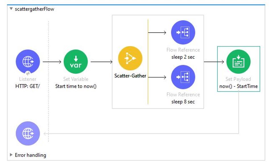 In the execution of scatter gather, the"sleep 2 sec" Flow Reference takes about 2 sec to complete, and the "sleep 8 sec" Flow Reference takes about 8 sec to complete.