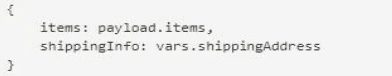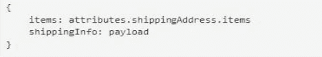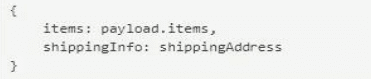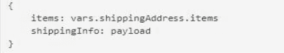 The Set Payload transformer needs to set an item key equal to the items value from the original received payload and a shippinglnfo key equal to the the ShippingAddress operation's response