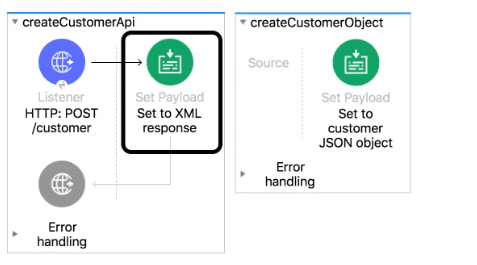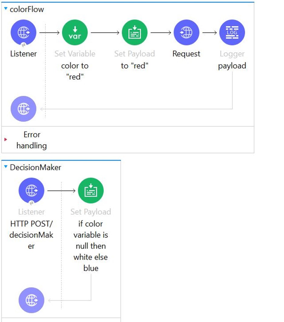 Refer to the exhibits. In the color flow , both the variable named color and payload are set to "red".