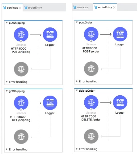 The two Mule configuration files belong to the same Mule project. Each HTTP Listener is configured with the same host string and the port number, path, and operation values are shown in the display names.