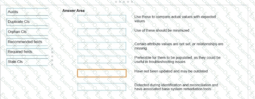 Drag and drop theCMDB Health Dashboard metricto the correctdescription.
