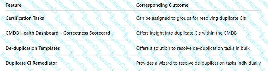 ACMDB Administrator seeks to understand the available tools for preventing addressing, and remediating duplicate CIs Drag and drop each feature with the corresponding outcome Some options may not apply.