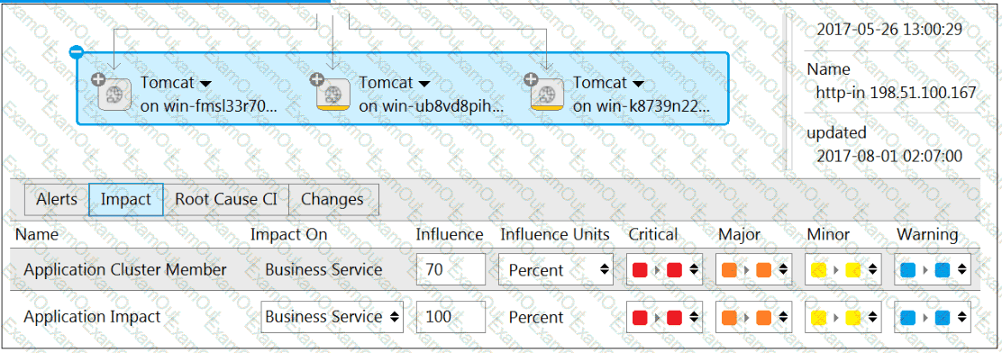 Given the following Impact settings and Alerts in a three node cluster that makes up the components of a Business Service, what is the overall service health of this Business Service?
