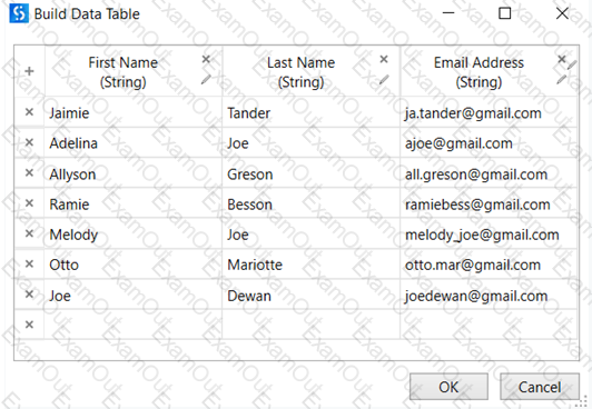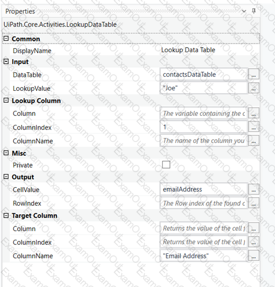 A developer uses a Lookup Data Table activity to return an email address of a person. What will be the result of the execution of the following seqeunce?