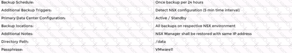 You have been asked to configure the NSX backups for the environment so that if the NSX Manager fails it can be restored with the same IP address to the original primary Data Center that is in an Active / Standby configuration. Backups should be scheduled to run once every 24 hours as well as when there are changespublished to the NSX environment. Ensure that backups are completed on their respective environment. Verify the backup file has been created on the SFTP server.