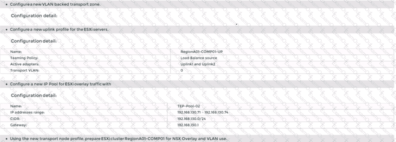 You are asked to prepare a VMware NSX-T Data Center ESXi compute cluster Infrastructure. You will prepare two ESXi servers in a cluster for NSX-T overlay and VLAN use.